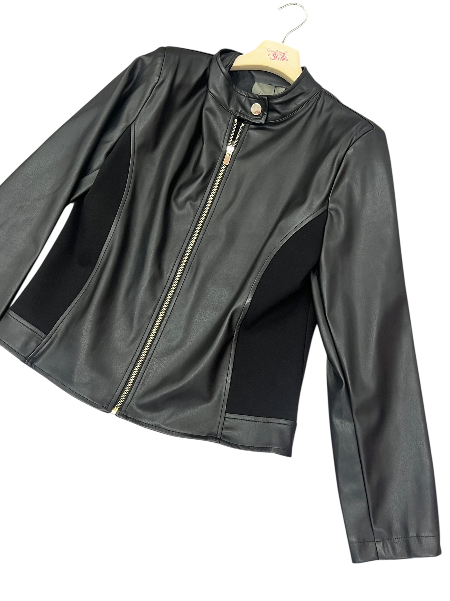 Giacca ecopelle curvy con fasce elastiche di tessuto sul fianco.