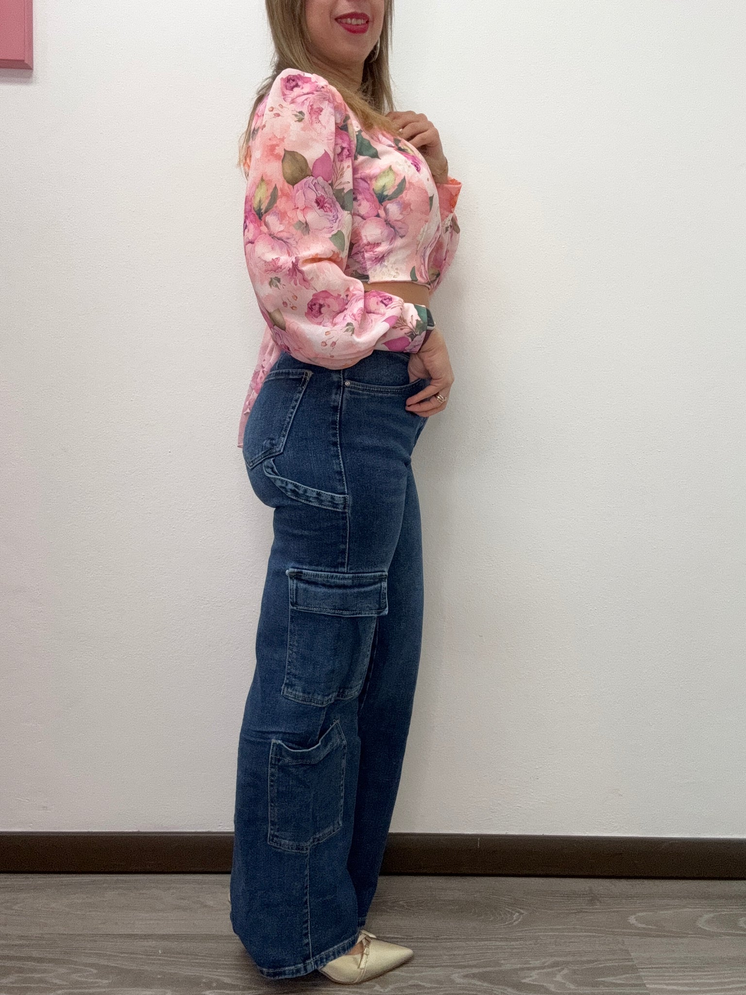 Jeans scuro cargo a palazzo. Vestibilità regolare. Per consulenza sulla taglia scrivici al numero whatsapp 3276205197